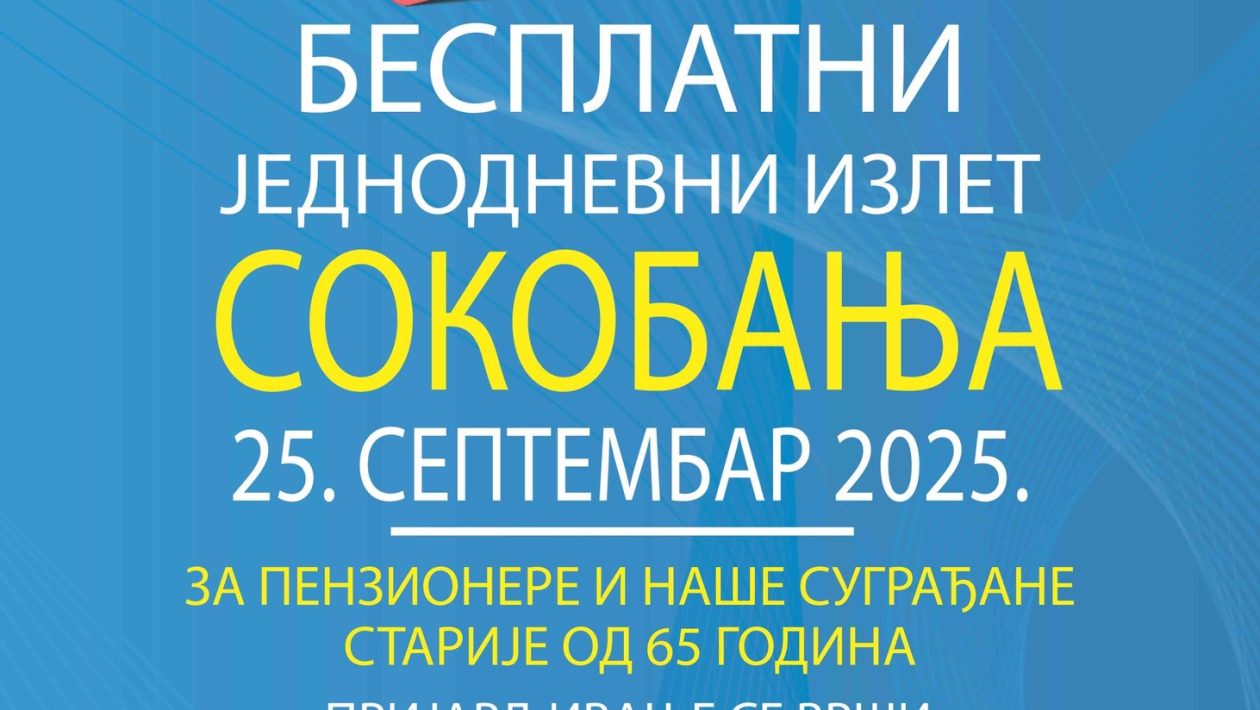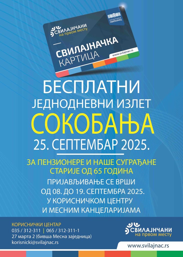 U okviru projekta „Svilajnčani na prvom mestu“ za sve penzionere i sugrađane starije od 65 godina, koji poseduju SVILAJNAČKU KARTICU, Opština Svilajnac organizuje dana 25. septembra BESPLATNI JEDNDNEVNI IZLET U SOKOBANjU.