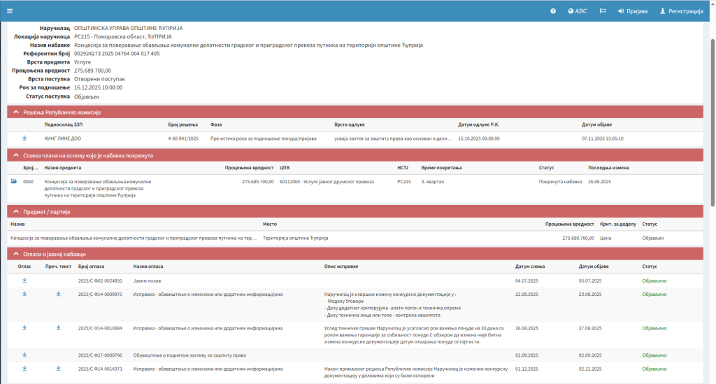 Javna nabavka ili koncesija se raspisuje na pet godina i obuhvata zajednički prevoz putnika na teritoriji opštine Ćuprija i prevoz đaka za osnovne škole. Inače, prevoz đaka za osnovne škole mora da se organizuje po posebnom režimu, koje organizuju škole posebnim tenderima i ne mora isti prevoznik da vozi sve škole na teritoriji Ćuprije.