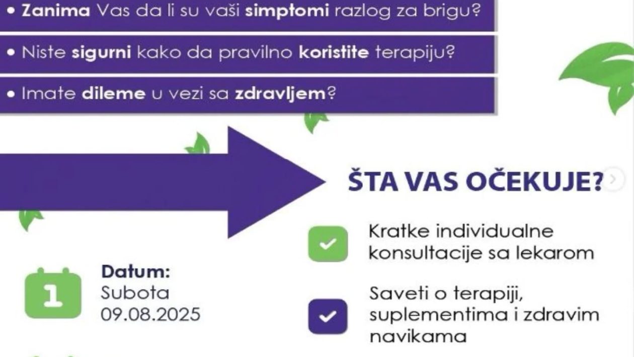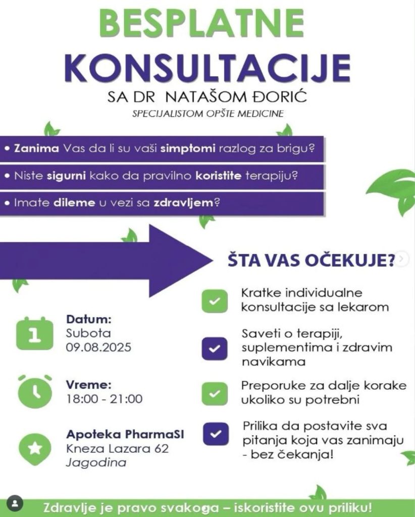 Besplatne konsultacije sa dr Natašom Đorić – specijalistom opšte medicine. U subotu, 9. avgusta od 18 do 21 čas, u Apoteka PharmaSI imate priliku da razgovarate sa dr Natašom Đorić, izuzetnim stručnjakom iz oblasti opšte medicine, poznatom po svom predanom radu i velikom doprinosu zdravlju lokalne zajednice.
