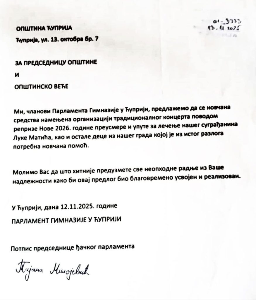 -Dobar dan predsednice, da li će Opština Ćuprija pomoći lečenje Luke Matića iz Ćuprije? Danima se organizuju akcije građana za prikupljanje pomoći? Advokat i učenici Gimnazije su uputili apel Opštini Ćuprija da novac za organizaciju prvojanuarskog koncerta prosledi za Lukino lečenje? Kakav je Vaš stav o toj inicijativi?