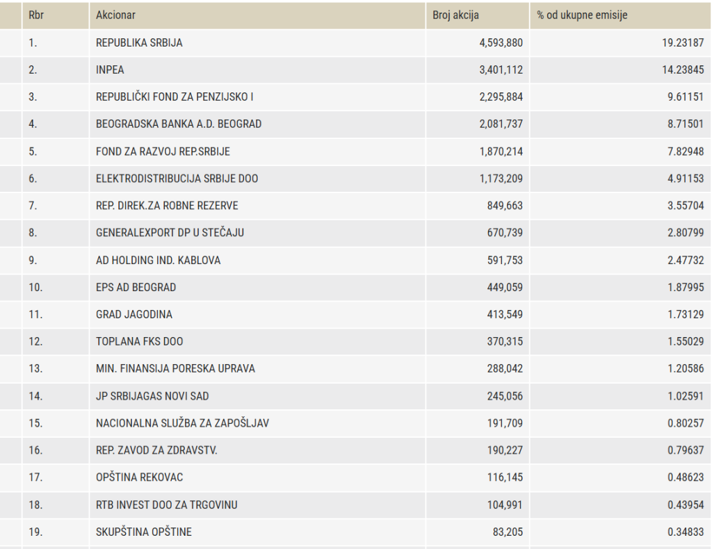 -Najveći akcionari ne iskazuju želju da učestvuju na skupštini, svima je poslat dopis i glasački listić u odsustvu, ako ne mogu da dođu da glasaju u odsustvu. Nije tu samo država, već recimo i Inves-import ima oko 15 dosto akcija. Država je većinski vlasnik sa preko 50 odsto. Sada je Holding kablovi sa većinskim državnim kapitalom, odnosno država, fondovi, opštine, ponavlja Stanković.