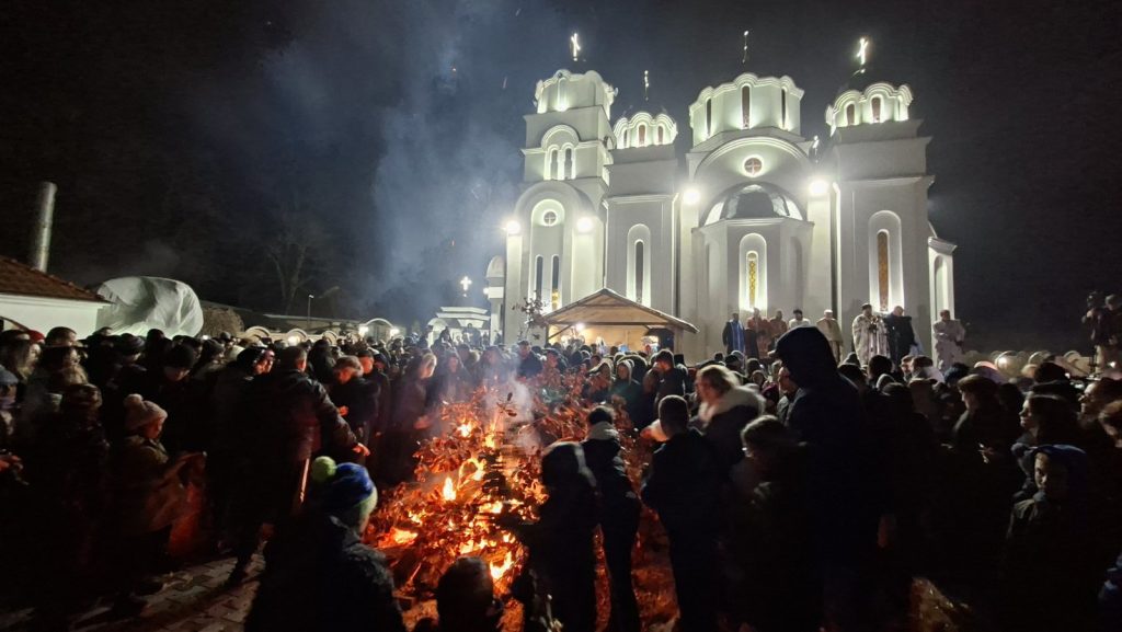 U porti hrama Svetoj Jovana Krstitelja u Končarevu kraj Jagodine, pred brojnim vernicima, obavljeno je tradicionalno paljenje badnjaka.
