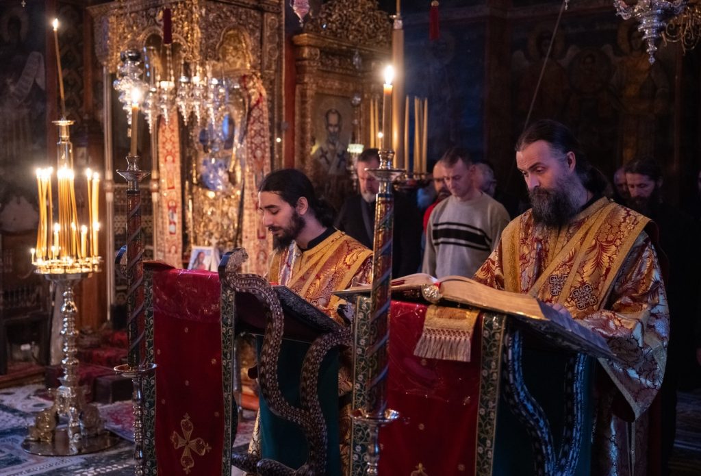 Lepoti bogosluženja su doprineli monasi iz manastira Grigorijata za desnom i hilandarski monasi i pojci hora „Sveti Simeon Mirotočivi“ za levom pevnicom.