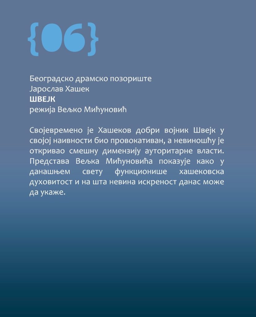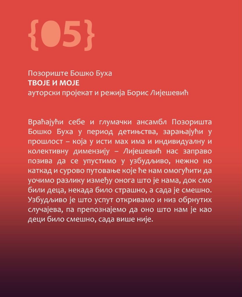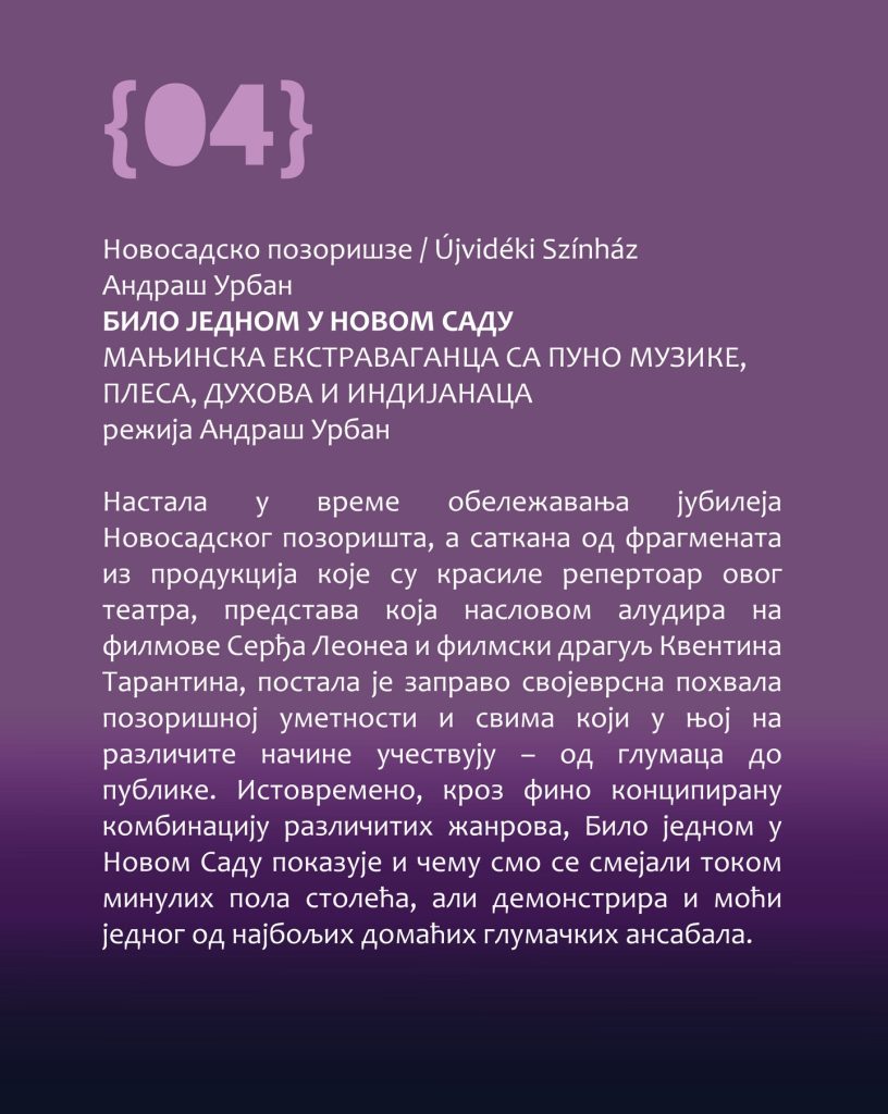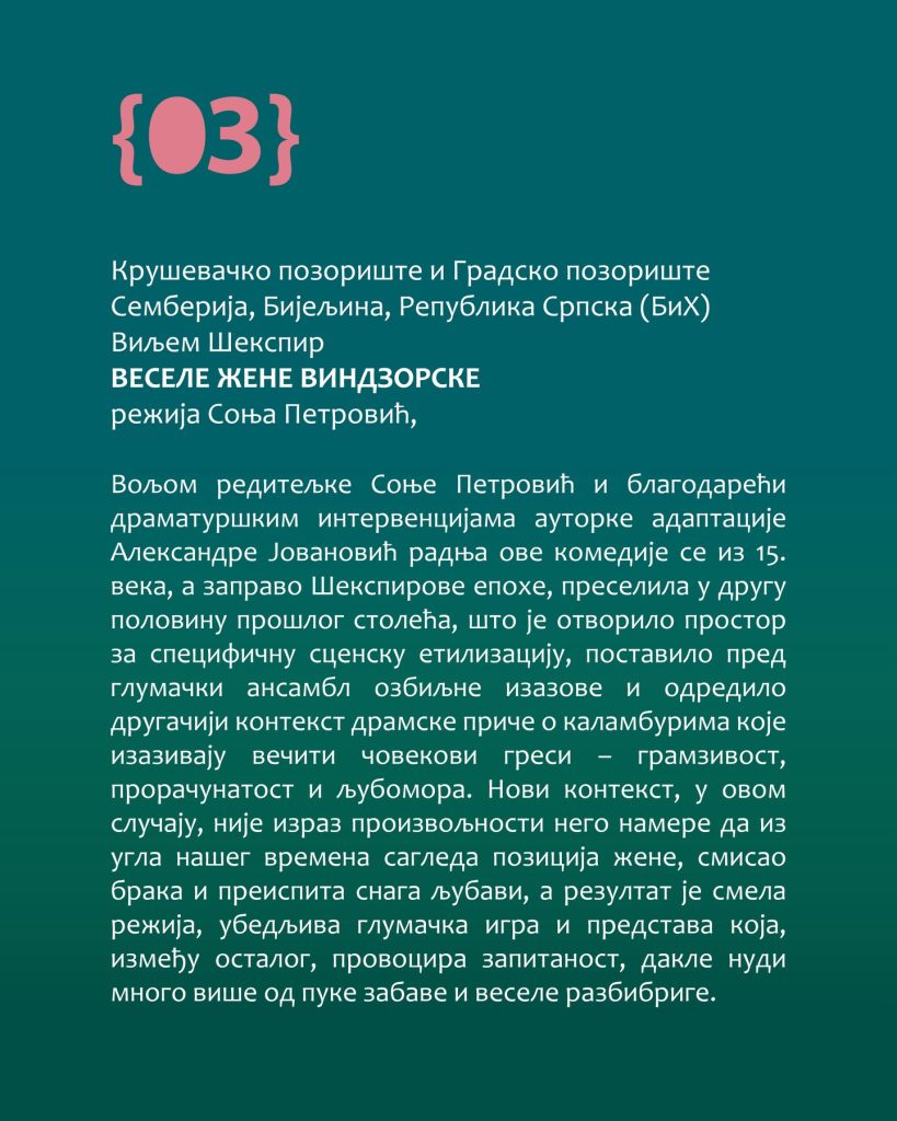 Pored takmičarskog programa, publiku očekuje i bogat prateći program – izložbe, promocije knjiga, razgovori o pozorištu i drugi sadržaji koji prate festivalske dane. Predstave počinju u 20.00