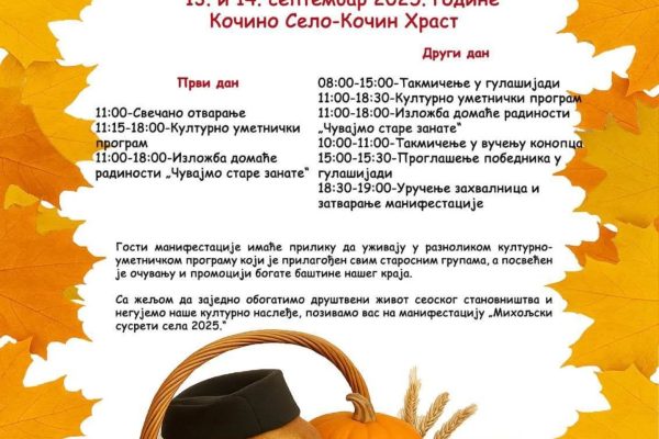 KOČINO SELO-KOČIN HRAST 13.oktobar 2025.-subota 11:00- Svečano otvaranje 11:15-Početak kulturno umetničkog programa, nastup KUD-a „Koča Anđelković“, Kočino Selo 12.30- KUD „Mladost“, Končarevo 14.00-KUD„Romanski vez“, Majur …